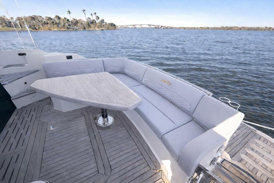 The foredeck welcomes you with elegant, elevated bulwarks for safety and style. A C-shaped lounge with adjustable backrests, a removable teak table, and a sleek stainless anchor system create a perfect gathering place. With a retractable Mediterranean sunshade, Fusion stereo, and soft blue accent lighting, the bow becomes your own private escape.