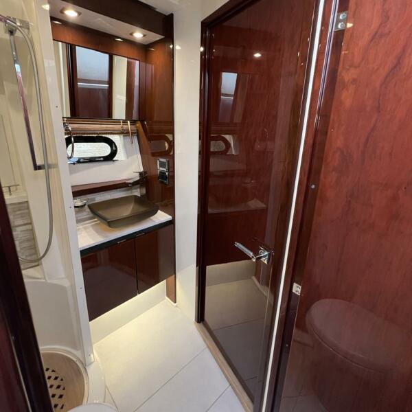 Below deck, the full-beam aft master suite is a private haven, featuring a walkaround berth, chaise lounge, washer/dryer, and Bose sound system. The ensuite master head offers a rain shower and spa-inspired finishes.