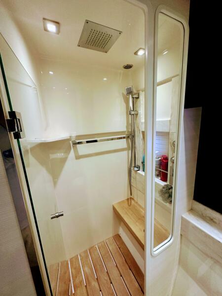 Full-beam, amidships master suite with en-suite head and separate stall showerForward guest cabin that converts from twin berths to a queen and includes a guest head and utility area (washer/dryer)
