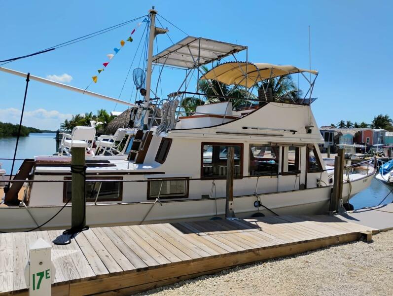 Introducing RESPITE the 1977 Marine Trader 40 Double Cabin, a true classic trawler that combines timeless design with modern functionality. This 40-foot vessel features a robust displacement fiberglass hull, ensuring stability and comfort on the water. Powered by twin Lehman 2715E diesel engines, RESPITE delivers a cruising speed of 7 knots and can reach a maximum hull speed of 10 knots, making it an excellent choice for leisurely voyages. Accommodating up to 6 passengers, the interior boasts two well-appointed cabins and two heads, providing ample space for relaxation and privacy. With her classic charm and practical features, the RESPITE, is perfect for those seeking adventure on the open seas, backwater sounds, the Loop, or simply a great liveaboard. RESPITE is located in a beautiful small marina in Key Largo, Florida with a renewable dockage agreement in place.
