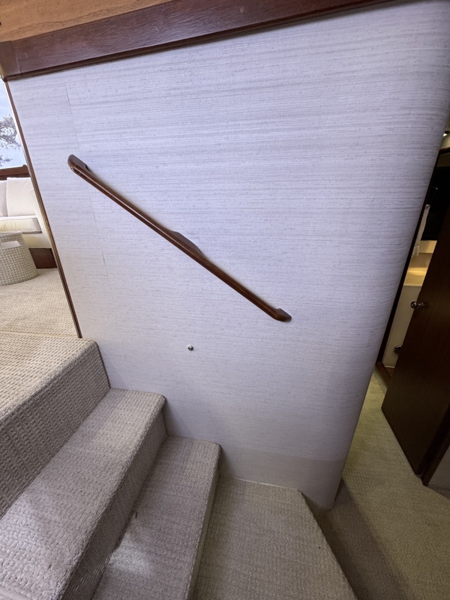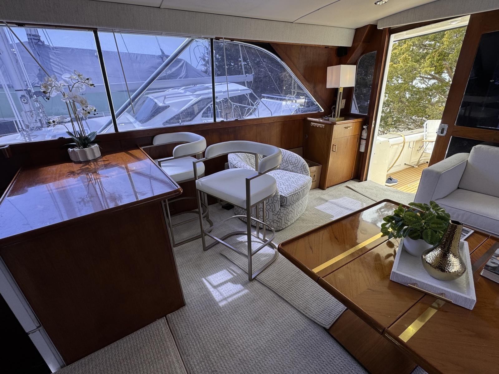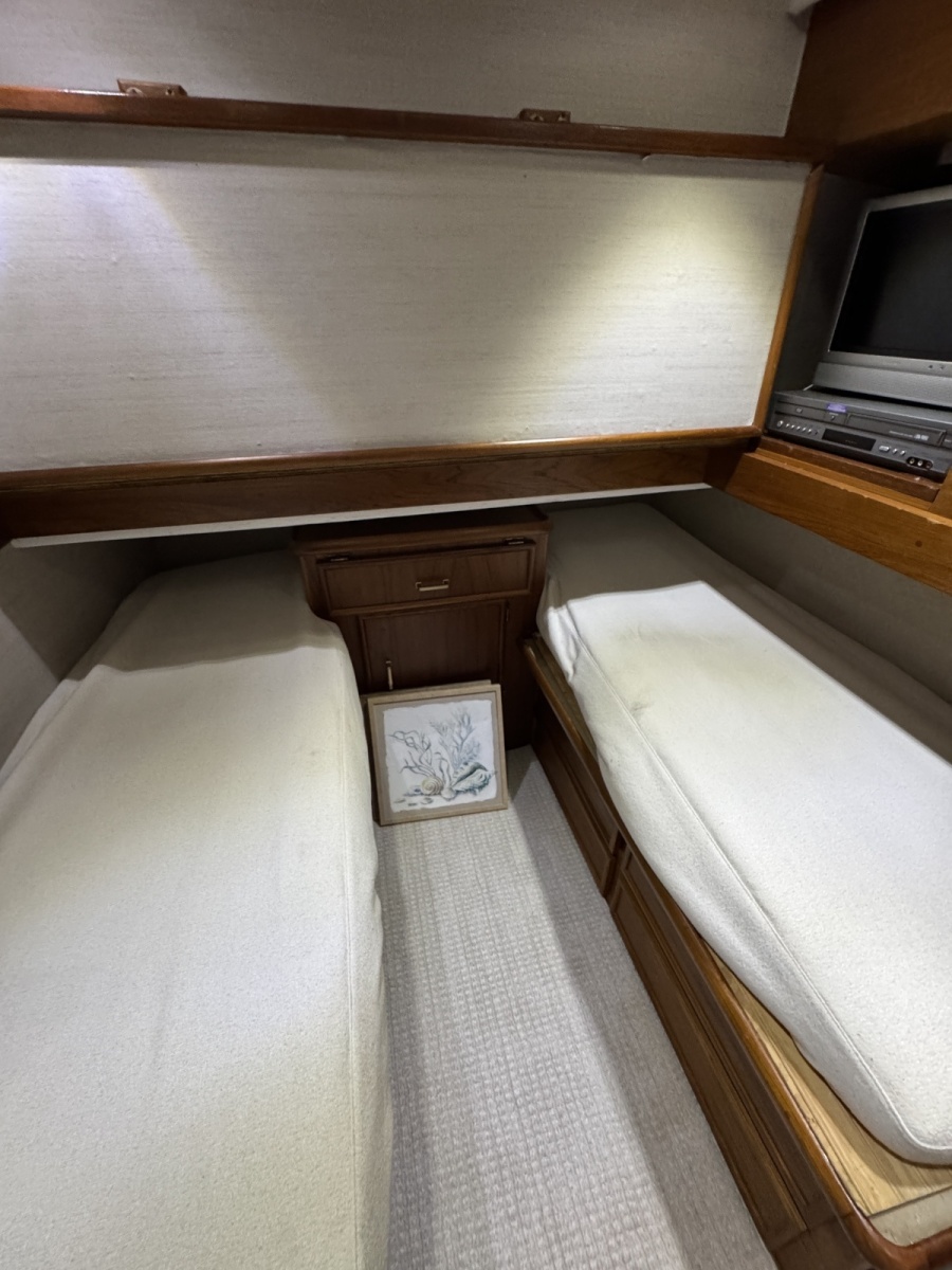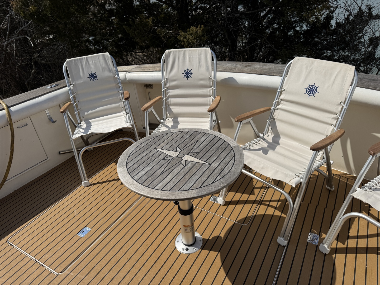 New Electronics Including Dual 12 inch Garmin Screens,GPS plotter, Radar. Chirp transducer, 2 new VHF radio's with hailer, Auto Pilot, Engine room camera, EPIRB. New Good windlass with 300ft rode new anchor 20ft chain. News Cushions on flying bridge, Reupholstered sofa and barrel chair. New granite countertop all faucets have been changed. New bed spreads, new wallpaper, new carpeting. New freshwater pump. Old teak deck removed recored with coosa board, gel coated and synthetic teak deck installed. Forward a/c controller replaced, new blinds and underwater lights, new mirrors in salon.