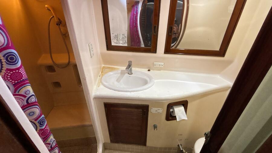 Accommodation combines luxury and versatility: a master suite aft with queen berth and private ensuite, two beautifully finished twin cabins, and a configurable Pullman berth for crew or guests. Each cabin is fully air-conditioned with high-quality joinery and thoughtful details throughout.