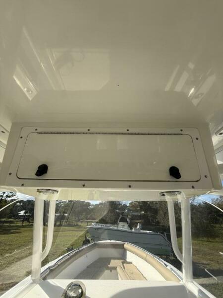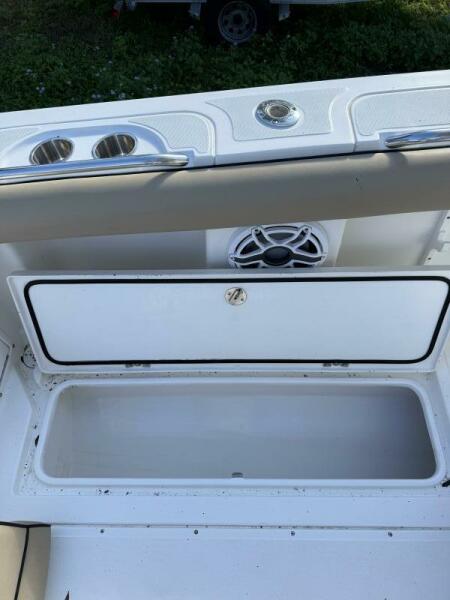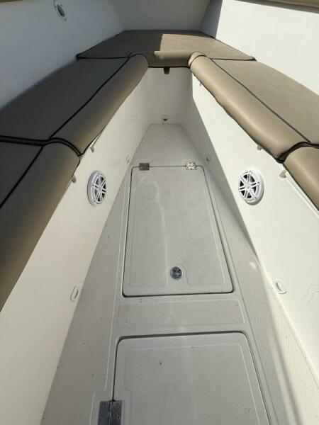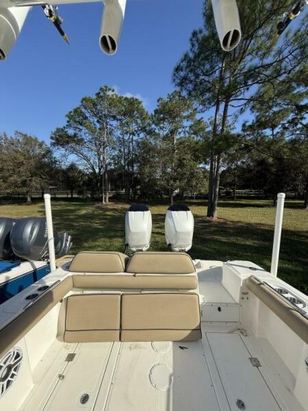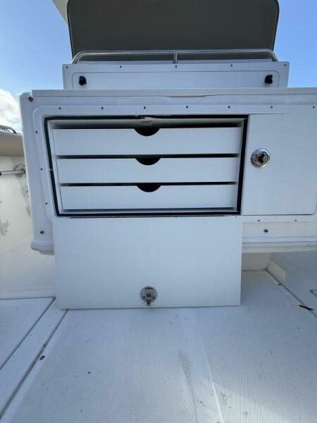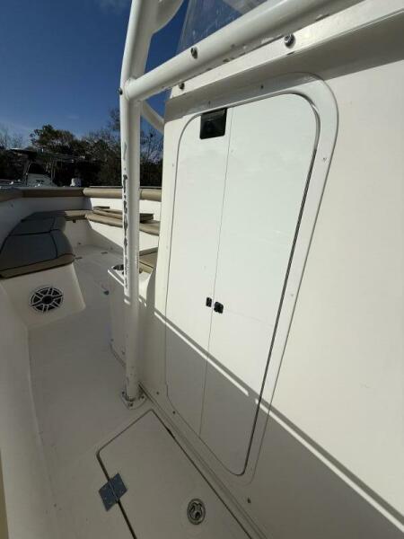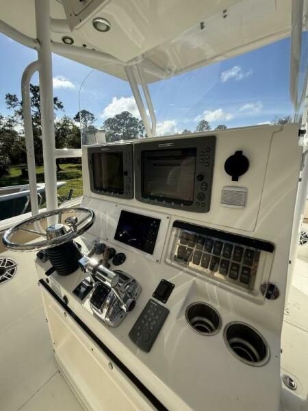 The boat features a spacious tackle center, Taco outriggers, and in-deck fish boxes, making it perfect for offshore fishing. The Mercury Digital Gauges provide real-time engine performance data, while the 221-gallon fuel tank ensures you can stay out longer without worrying about running low. Fusion Radio and JL Audio speakers bring great sound for those moments of relaxation, and the console with head offers added comfort for extended trips.