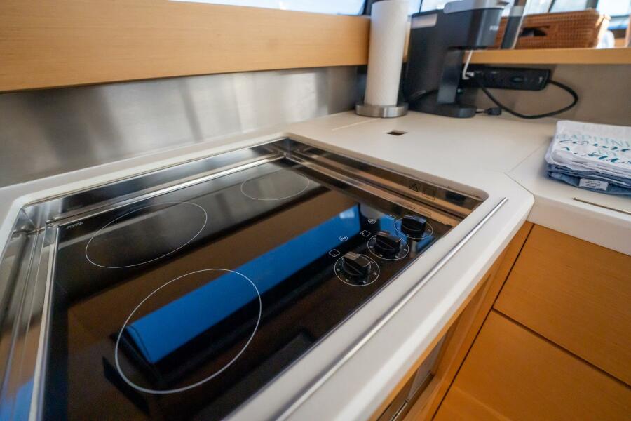 Spacious and Modern Interior: 3-stateroom, 2-head layout with light oak finishes, leather sofas, and wood flooring. The salon features panoramic windows, a 26" flat screen TV, and a BOSE stereo system and Sonos stereo system. The gourmet galley features a full-size refrigerator, a 4-burner stovetop, and a microwave for seamless entertaining.