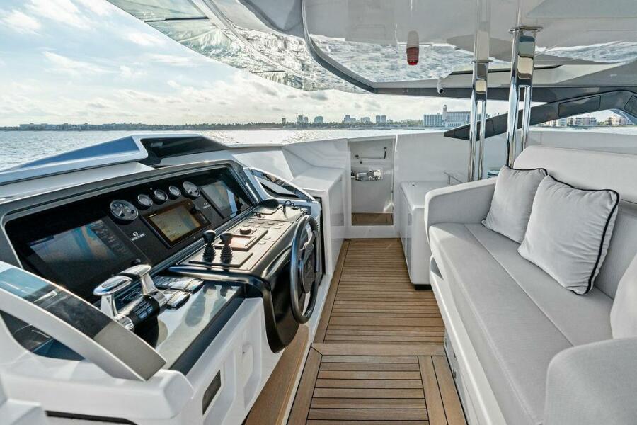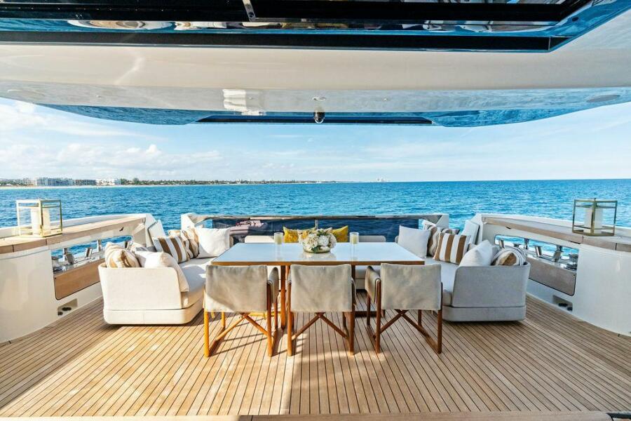 The outdoor spaces are a standout feature of the Custom Line 120’. The expansive flybridge offers multiple seating and dining areas, perfect for alfresco living, while the aft and fore decks provide additional options for sunbathing, dining, or quiet relaxation, whether underway or at anchor.