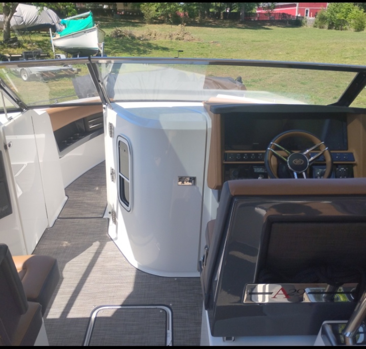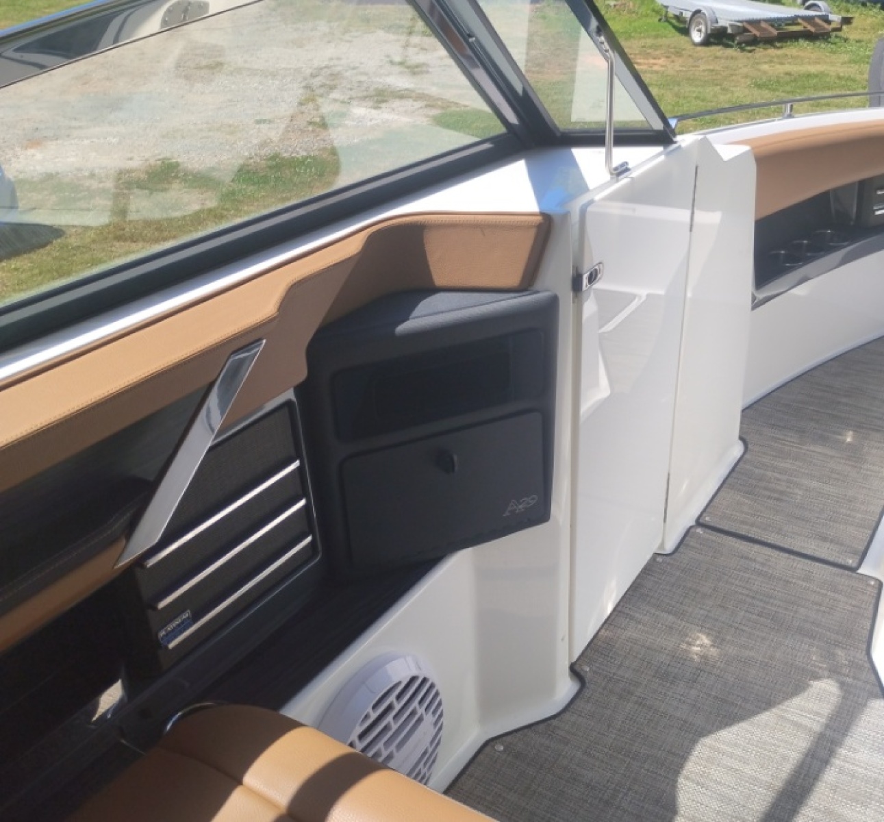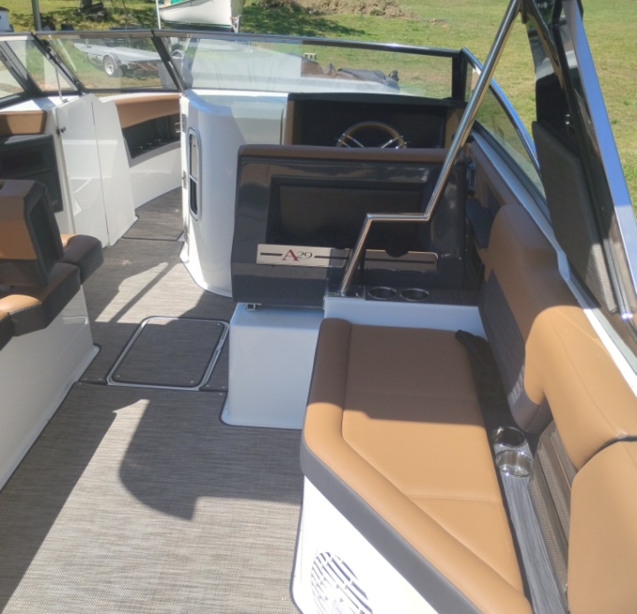 • Performance & Handling: The A29 features an extended running surface for faster planing, sharper turns, and reduced bow rise. Powered by a Volvo Penta V8-380 hp engine, it offers robust power and easy maneuverability.