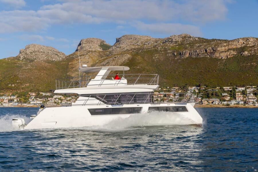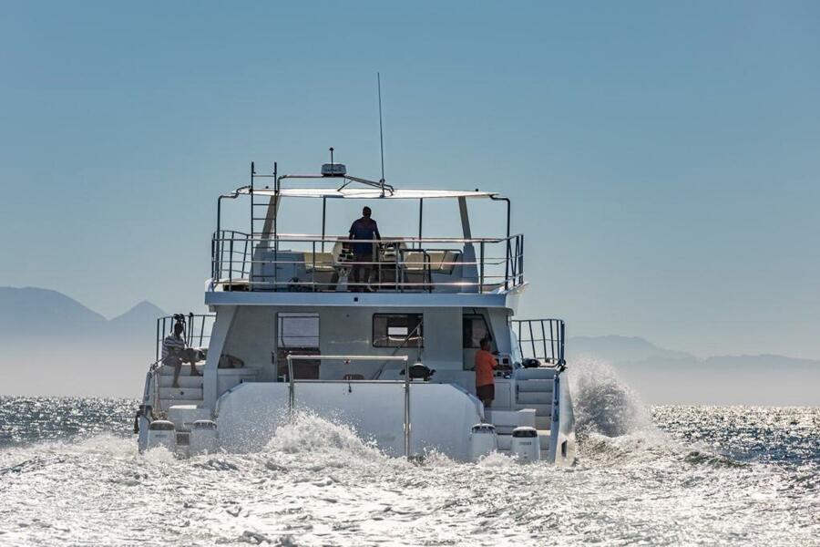 Powered by four 300 hp Suzuki outboard engines, this vessel redefines the future of pleasure catamarans.